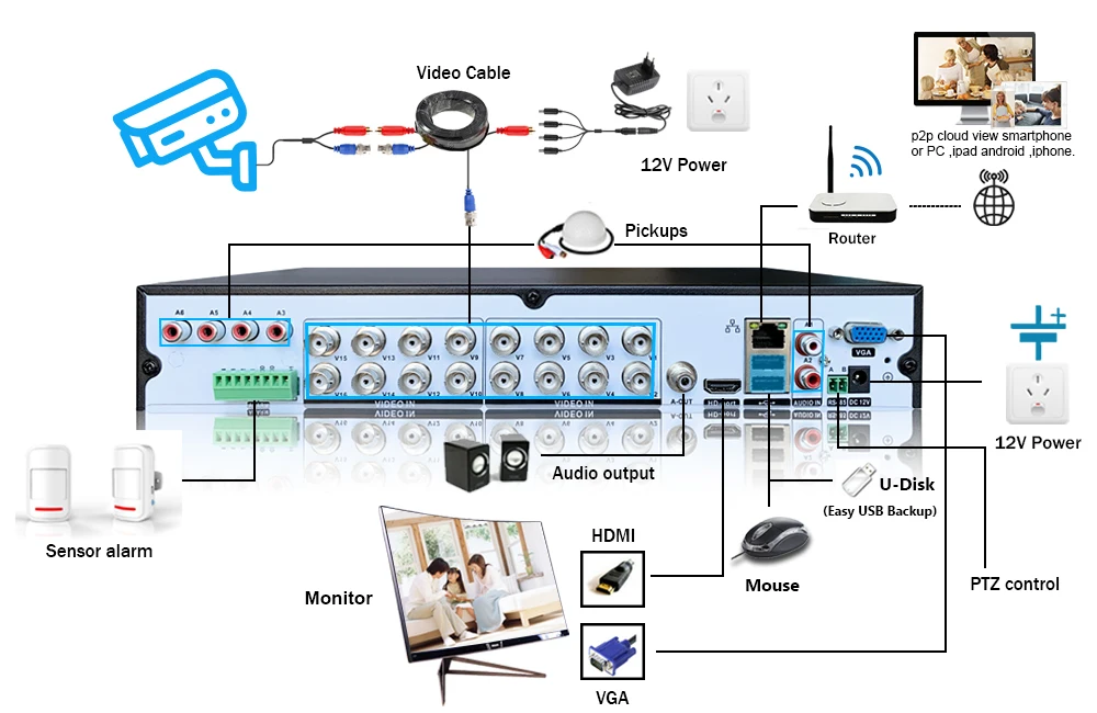 Easy setting , just 4 steps for mobile phone viewing,View live video of the system from anywhere and anytime via you smarphone, table or PC with advanced P2P technology, you are able to remote access your system in minutes or less, no portforwarding needed, remote access has never been so easy!!!
